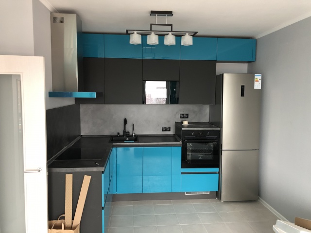 Небесно-голубая кухня с фрезеровкой и диагональными линиями