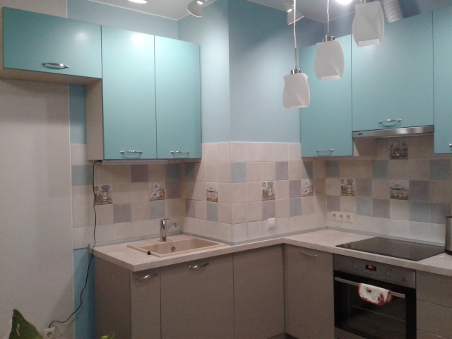 Небесно-голубая кухня с фрезеровкой и диагональными линиями