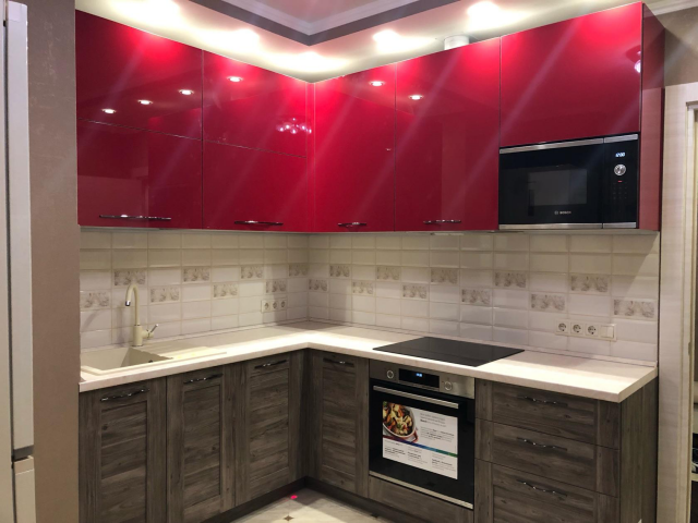 Акцентная Г-образная кухня под потолок