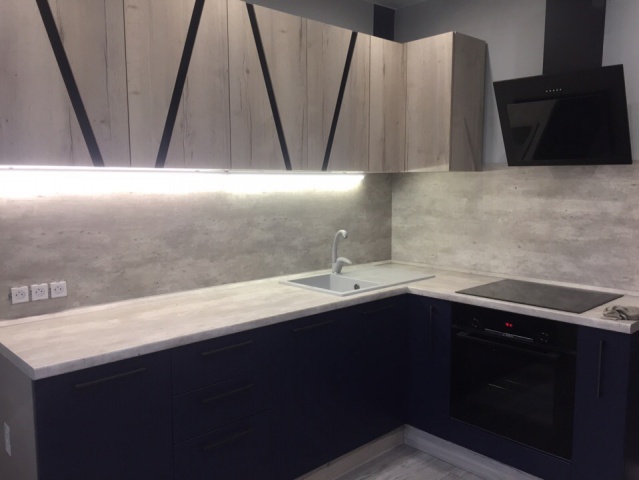 Небесно-голубая кухня с фрезеровкой и диагональными линиями