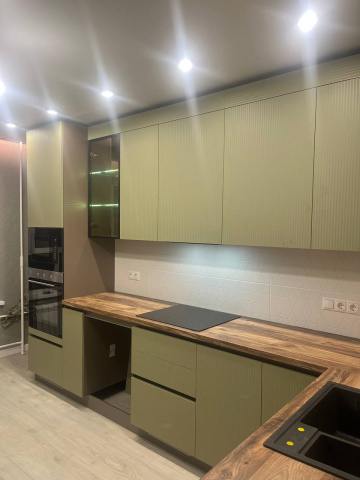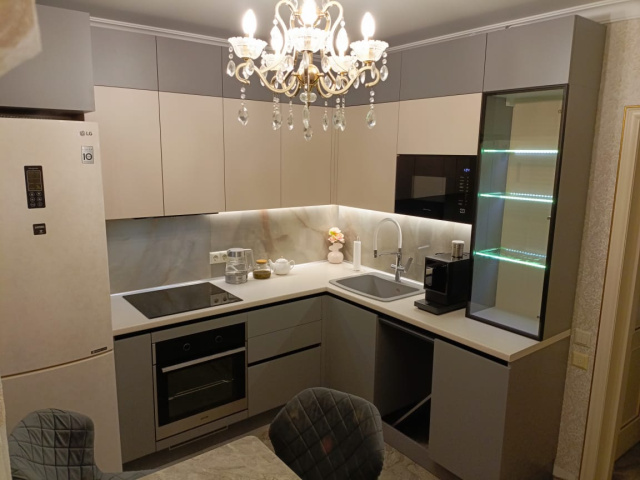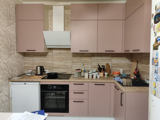 Г-образная кухня с бархатистыми фасадами