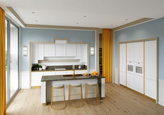 • Разнообразие фактур. Белоснежные фасады могут быть матовыми, полуматовыми или глянцевыми. В любом варианте они будут смотреться эффектно и презентабельно.