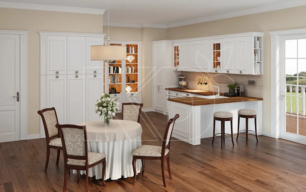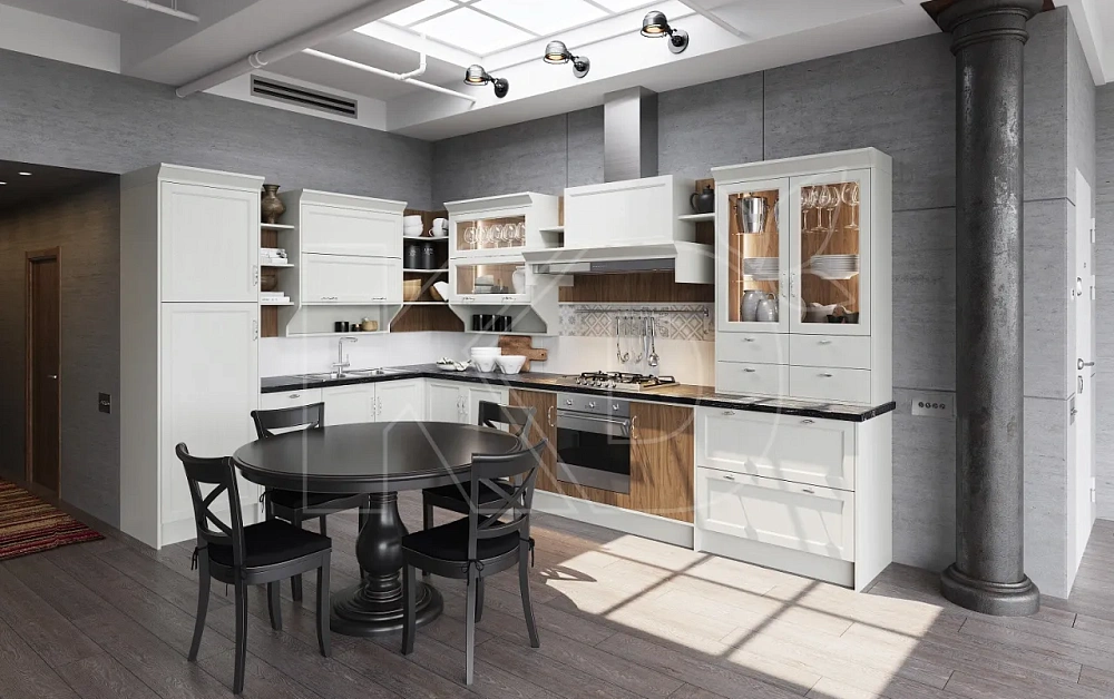 - Размер. Мебель размещается в больших столовых и поэтому имеет большие размеры. Планировка - П-образная или квадратная, обычно с островом. Кухонные гарнитуры более сложные и часто имеют барную стойку или витражные шкафы. Дешевые модели обычно меньше по размеру и имеют линейную планировку.