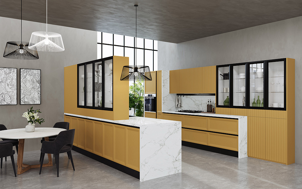 Ранее популярными были кухонные гарнитуры с гладкими и однотонными фасадами. Однако сейчас дизайнеры и производители кухонной мебели всё чаще предлагают разнообразные фактуры и отделку. Фасады с текстурой, фрезеровкой, резьбой и стеклянными вставками придают кухне оригинальности.