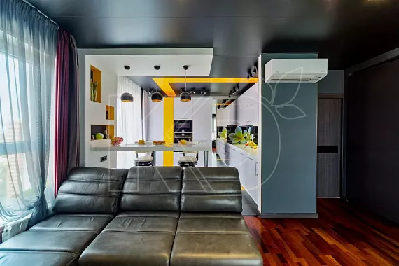 Это один из самых популярных и простых способов визуально разделить кухню и гостиную. Он хорош тем, что конструкция выполняет несколько функций: заменяет обеденный стол и подходит для быстрых перекусов, предоставляет дополнительные места для хранения принадлежностей. Чтобы барная стойка красиво смотрелась, ее стоит выполнить из того же материала, что и кухонные фасады.