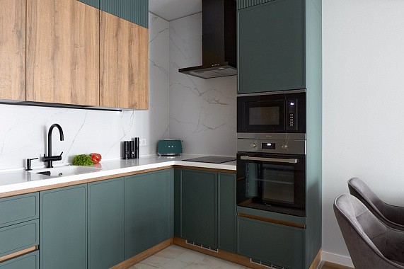 От выбранного материала зависит не только эстетика, но и долговечность. Например, фасады из массива лучше всего смотрятся в просторных кухнях с островом, а лаконичные эмалированные поверхности оптимальны для проектов, где важна компактность и эргономика.