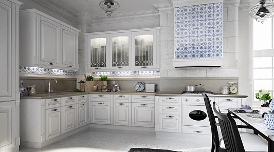 Классическая кухонная мебель обычно подбирается под основной цвет интерьера, также допустимо использовать натуральное лакированное дерево без покраски. Многие выбирают для кухни сдержанные светлые тона. Например, кремовый, айвори, капучино, сливочный, мятный, бледно-васильковый. Светлые оттенки универсальны. Они одинаково хорошо подходят и для просторной, и для небольшой кухни. Светлые гарнитуры помогают зрительно расширить пространство в помещении. Данный эффект усиливается при использовании гладких глянцевых фасадов, отражающих свет.