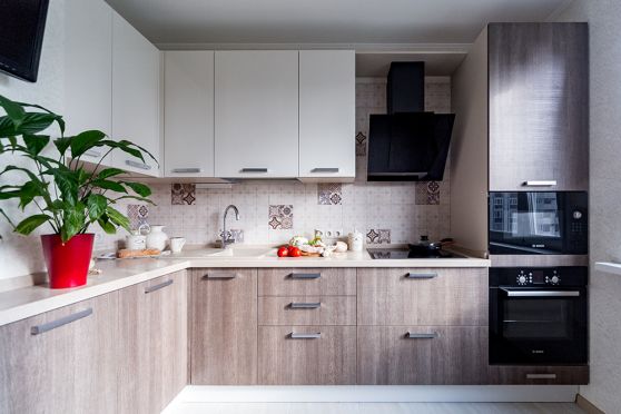 Удачный вариант для квадратной комнаты – угловая кухня. Она позволяет разместить рабочие зоны вдоль двух смежных стен.