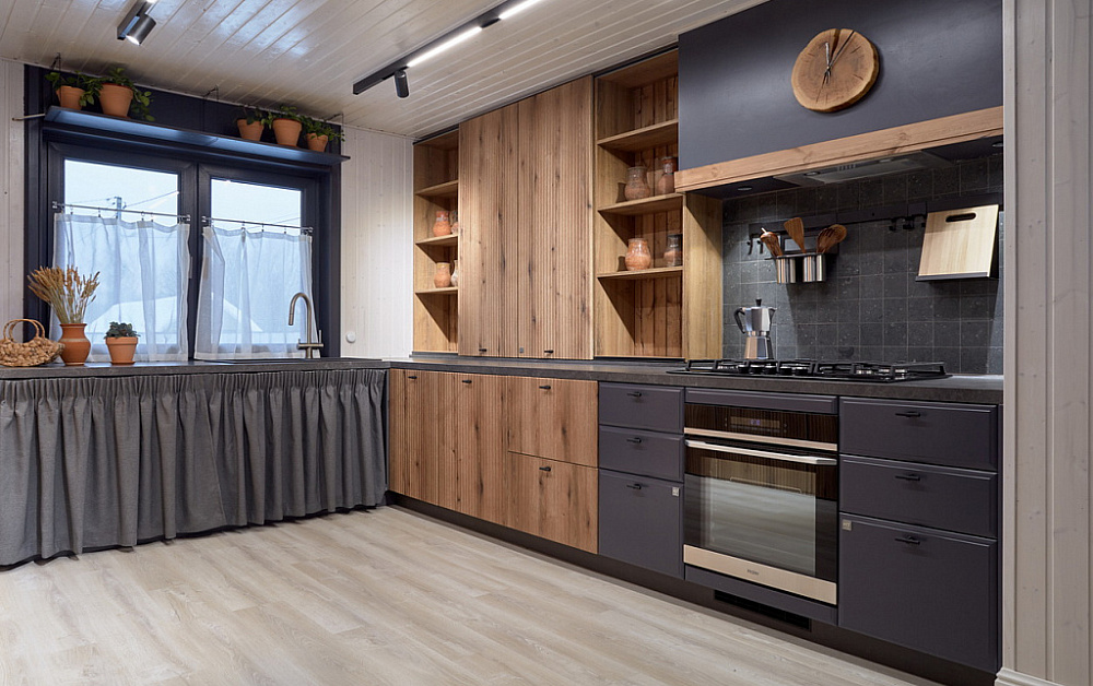 Если стены кухни не позволяют установить стандартный комплект мебели, рекомендуем заказать кухню по индивидуальным размерам. В этом случае дизайн-проект будет реализован с учетом особенностей помещения. Например, ниши будут использованы для установки полок и бытовой техники.