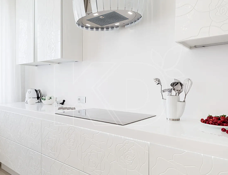 И еще один образец в линейке «Кухонный Двор» – «Фаворит 3 с фрезеровкой Роза». В этой модели современный стиль сливается с природными мотивами. Главным акцентом в кухне глянец с фрезеровкой выступает изящная фрезеровка в виде цветов. Она смотрится свежо и эстетично.