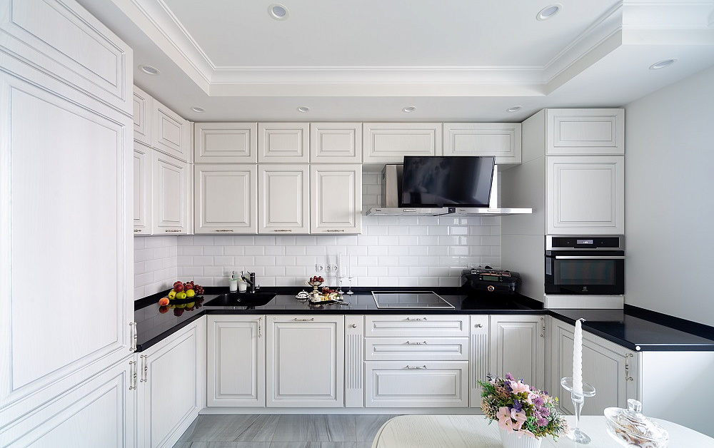Для небольших помещениях белая кухня – настоящая находка, способная визуально увеличить пространство. Обеспечивается это за счет того, что светлые поверхности отражают солнечные лучи. Разбавить монотонность белоснежных фасадов можно с помощью ярких акцентов – фартука, рабочей поверхности и элементов декора.