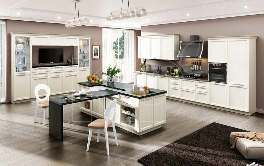 Для отделки фасадов таких кухонь применяется минималистичный декор в виде вставок, филенок, лаконичной резьбы. Геометрические формы сдержанные – прямоугольные или квадратные. Современный модерн предполагает отказ от излишеств и усложненных конструкций.