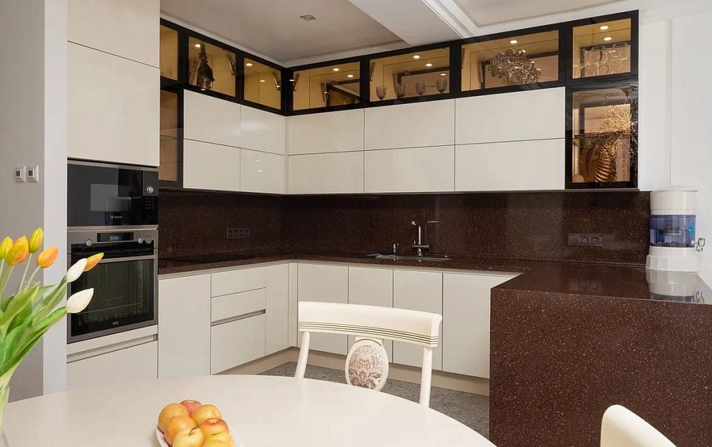 Подобные гарнитуры выполняют в сдержанных нейтральных оттенках. Модерн – сочетание традиционных и классических линий, поэтому для отделки фасадов применяется лаконичный декор, стеклянные и металлические вставки.