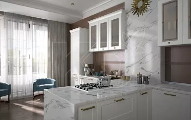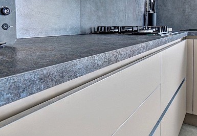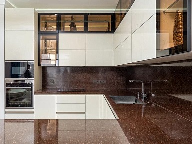 Часто столешницы создают из искусственного камня – они прочные и надежные. Этот композит может выполняться из различных пород камня.