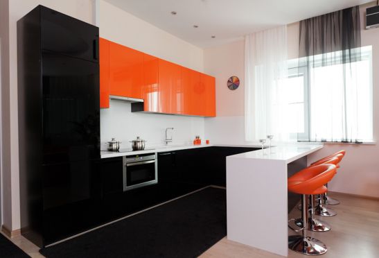 Кухонную мебель черного цвета часто украшают контрастными вставками. Наиболее эффектно смотрятся варианты с красными, белыми, зелеными и желтыми элементами.