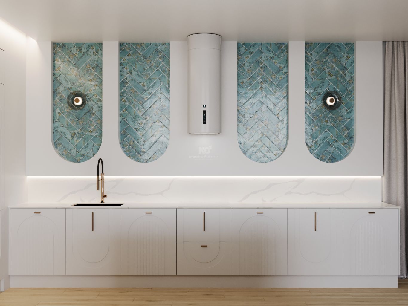 Ведущая доминанта кухни — рабочая зона с исключительно нижними модулями. Арочная фрезеровка на фасадах, направленная и вверх и вниз, придает пространству динамику. Мраморный рисунок на столешнице и фартуке отсылает к древнегреческим храмам, над ним — уложенная елочкой бирюзовая плитка. Элемент фартука? Больше. Это полноценный арт-объект.