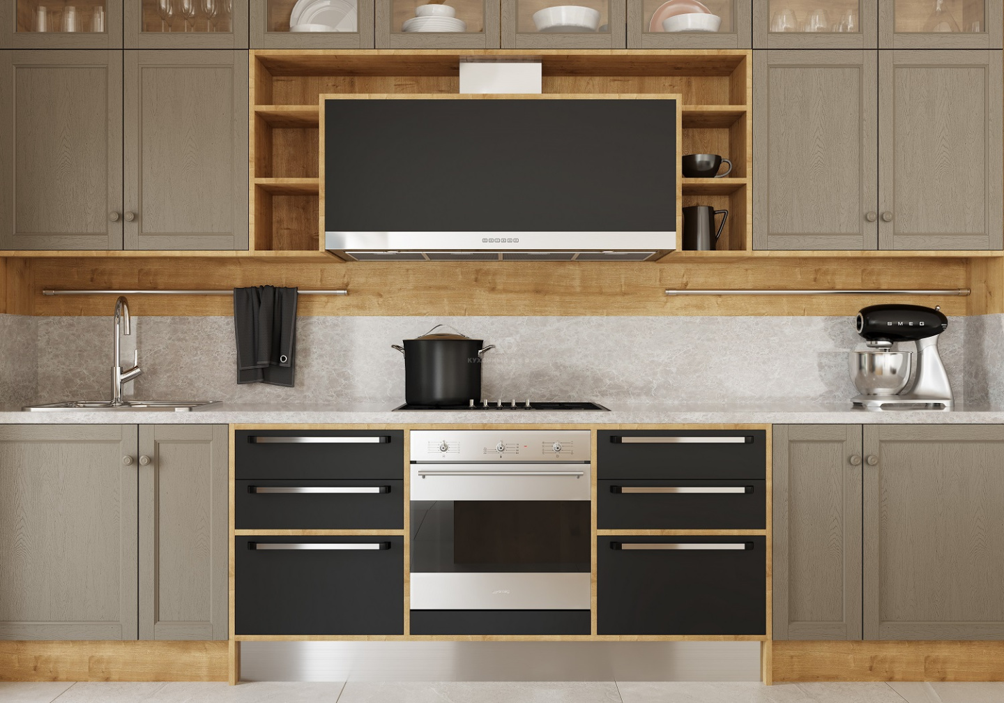 Оригинальность и колорит – это про «Хельгу»! Ее образ мысленно отсылает нас к добротной мебели американских салунов времен Дикого Запада. Эта кухня наполнена таким же шармом, свободой и тягой к смелым решениям. «Хельга» создана с использованием роскошного шпона дуба. В ней прекрасно сочетаются классические рамочные фасады и абсолютно гладкие фасады в стиле «модерн». Взгляните, сколь обворожительна эта комбинация, особенно если цвета подобраны со знанием дела. Благородный «табачный» отлично смотрится в паре с чарующим графитовым, не так ли?